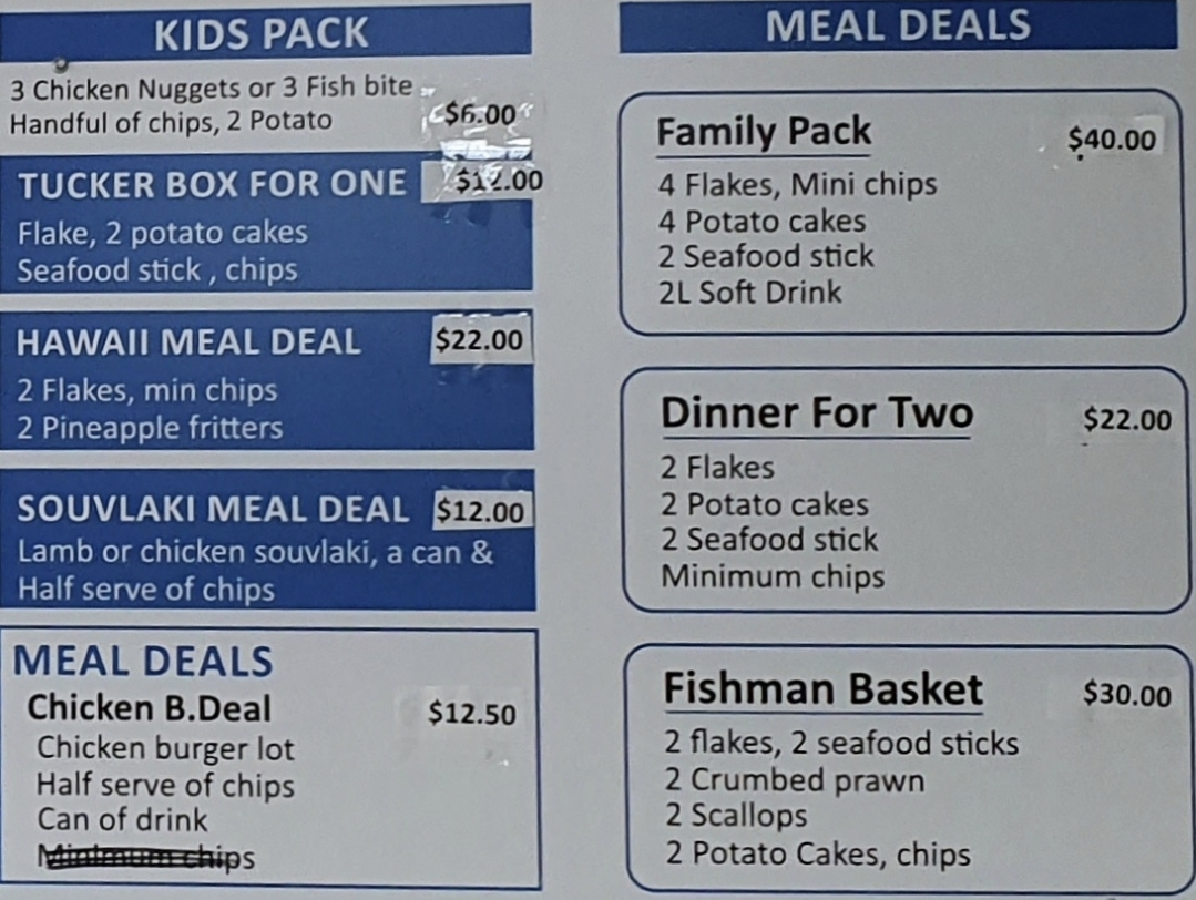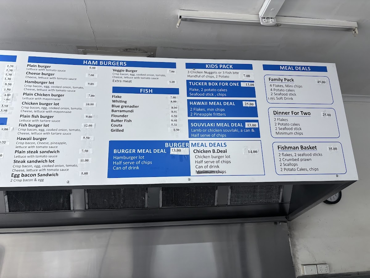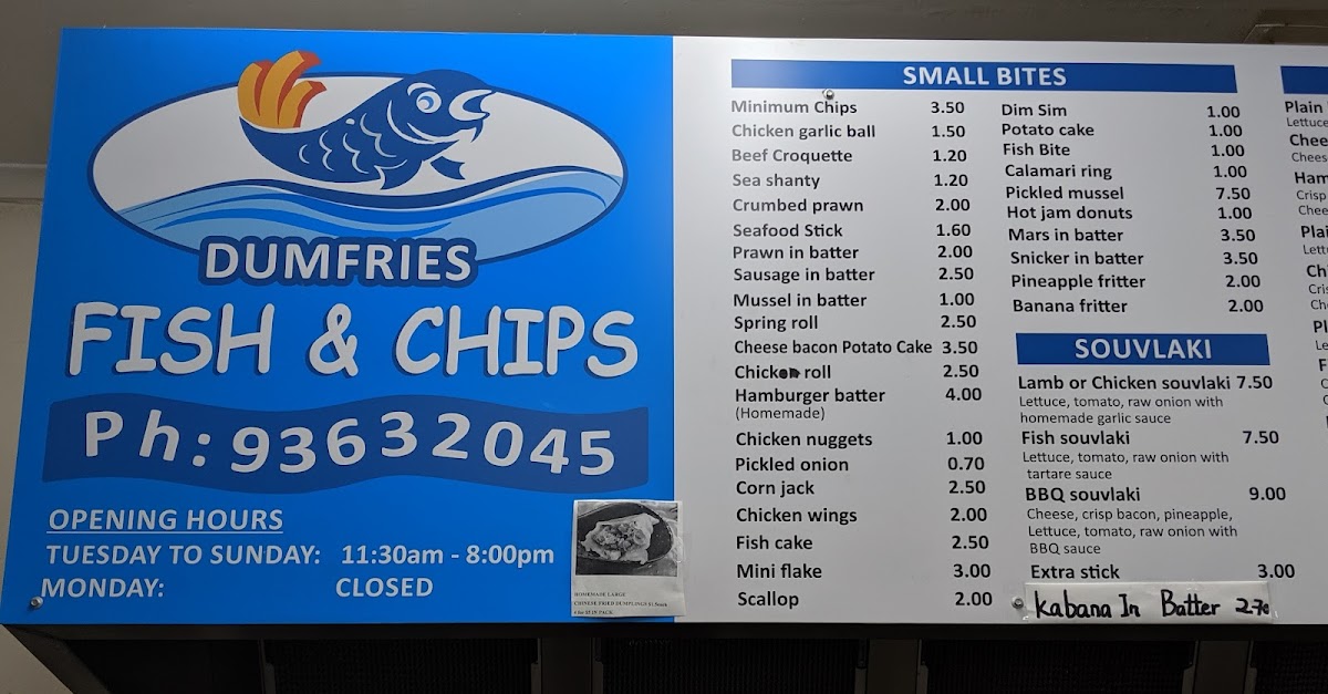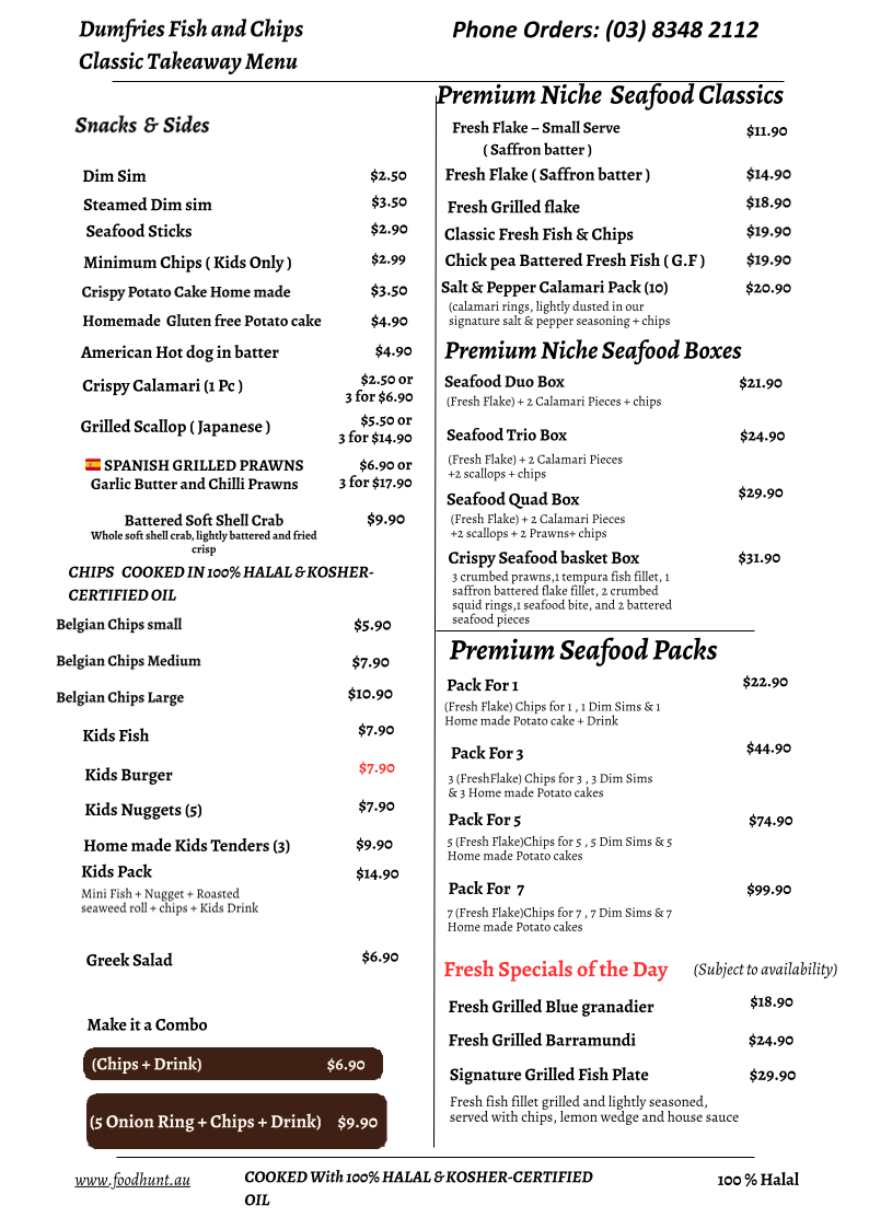 Overall, the menu at Dumfries Fish And Chips offers an impressively diverse range that goes well beyond the typical takeaway, making it a satisfying spot for a variety of cravings. From classic staples like Fresh Flake - Small Serve, Classic Fresh Fish & Chips, and the gluten-free Chick pea Battered Fresh Fish (G.F) to hearty options such as the Seafood Trio Box and Crispy Seafood Basket Box, the seafood selection is clearly a highlight. The inclusion of gourmet choices like Fresh Grilled Barramundi and Signature Grilled Fish Plate adds a premium touch. Beyond seafood, the menu expands into filling options like the Double Brekky Roll (Halal), Wagyu’s Egg Roll, and satisfying burgers such as the Hero Chicken (Grilled or Crispy) and Crispy Fish Burger. There’s also plenty for those seeking variety, including wraps like the Chicken Shawarma, indulgent bites like Buffalo Wings (8) and Corn Ribs, and even desserts like Belgian Chocolate Cheesecake. Drinks such as Watermelon Juice (100%) and Glass Bottle Coke 330ml round out the offerings. Altogether, the menu feels thoughtfully curated, balancing traditional fish-and-chip favorites with modern, diverse additions that cater to a wide range of tastes.
